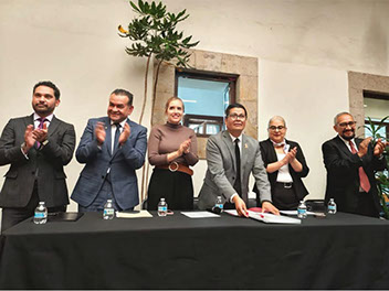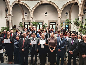 Dr. Federico González Santoyo (Rector-INIDEM), Lic. Francisco Ramírez Flores (Secretario de la Contraloría), Lic. Azucena Marín Correa (Magistrada de la 5ª sala del Tribunal en materia Anticorrupción y Administrativa del Gob. Mich.), Lic. Salvador Daniel Casas García (Director de Incorporación, Control y Certificación de la SEE-Mich.), Dr. Sergio García Lara (Director del área Jurídica de la Secretaria de Finanzas del Edo de Mich.), Mtra. Neria Georgina Rojas Moran (Directora de Profesionalización del Go. Edo de Mich.)
